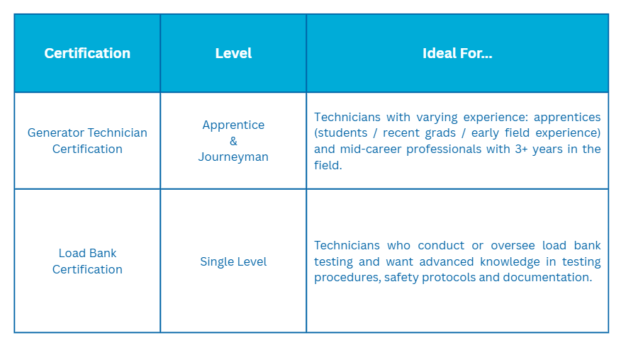 EGSA’s certification programs are designed to recognize and validate the technical knowledge, skills, and professionalism of individuals working in the onsite power generation industry. These credentials signal competence in installation, service, maintenance, and repair of generator systems — making EGSA-certified technicians stand out to employers and clients alike.